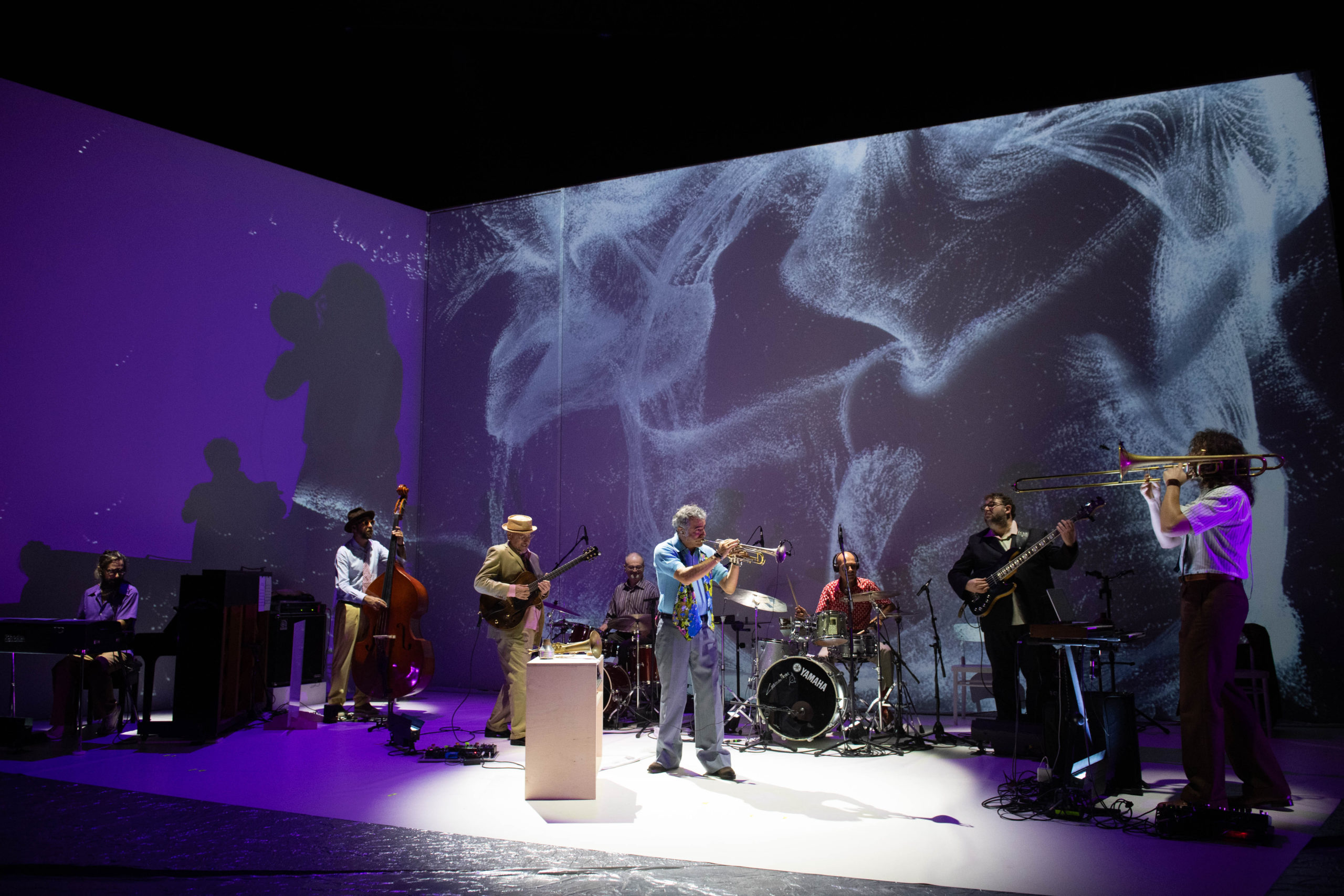 La narrazione intreccia episodi autobiografici di Fresu – soprattutto l’apprendistato del jazz fra gli anni Settanta e Ottanta – con storie di vita e arte di Miles Davis, permettendoci di cogliere quanto la sua influenza abbia plasmato il jazz contemporaneo: un punto di riferimento musicale e umano, capace di una rivoluzione stilistica e culturale senza precedenti e di determinazione nell’affrontare le discriminazioni del suo tempo. Insieme a Fresu, sul palco, una formazione di sette fuoriclasse e diversi strumenti, acustici ed elettrici, esegue brani ispirati al repertorio di Davis accanto a composizioni originali che catturano l’essenza del musicista americano. Sul grande fondale alle spalle dei musicisti scorrono elementi visivi integrati con la musica: una speciale tecnologia elabora dal vivo un visual, sulla base di impulsi biometrici e acustici registrati dai sensori indossati da Fresu, trasformando ogni gesto del trombettista in un’esplosione cromatica che amplifica l’impatto emotivo dei brani.